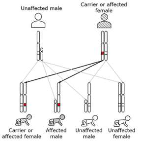 • 1 in 4 chance (or 25% chance) that the child will have an X and Y chromosome (male) and does not inherit the pathogenic variant. They would not be at risk of having this condition.