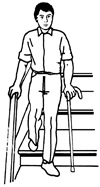 - Lift your cane and weaker leg up to the first step. Use the handrail to help lift you up.