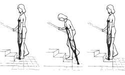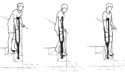 - Lower your crutches, then your injured leg, to the next step.