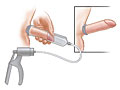 A vacuum device, which is sometimes used to treat erection problems (erectile dysfunction), is a tube made of plastic that fits around the penis. You coat the base of the penis with lubricant and insert the penis into the tube. Air is pumped out of the tube, which creates a vacuum. The vacuum helps blood flow into the penis, producing an erection-like state in about 5 minutes. A constrictive band is placed around the base of the penis to maintain the erection, and the tube is removed.