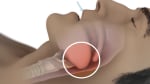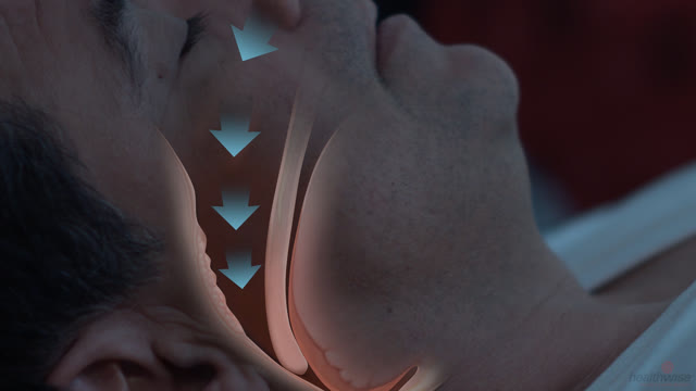 Normal airway, showing air flowing through open airway, compared to obstructive sleep apnea, showing air flow blocked by tongue in narrowed airway.