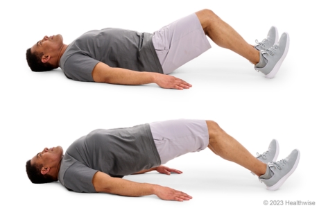 - Lie on your back with both knees bent and your ankles bent so that only your heels are digging into the floor. Your knees should be bent about 90 degrees.