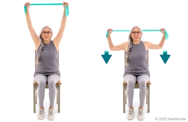 - Stand or sit up straight in a chair without arms. Grasp an exercise band with your hands about shoulder-width apart.