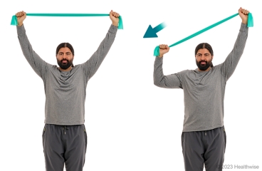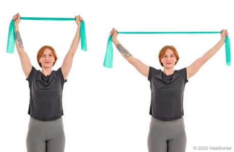 - Slowly pull your hands apart, stretching the band. Hold for 1 to 2 seconds.