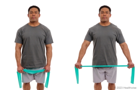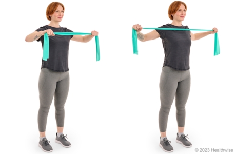 - Slowly pull your hands apart and your shoulder blades together, stretching the band. Hold for 1 to 2 seconds. Try to keep your hands up at your chest level, and do not pull your shoulders up toward your ears.