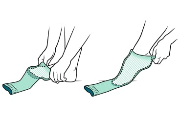Use both hands to grasp the folded part of the stocking about 5 centimetres (2 inches) below the fold. Pull that section up over your ankle.