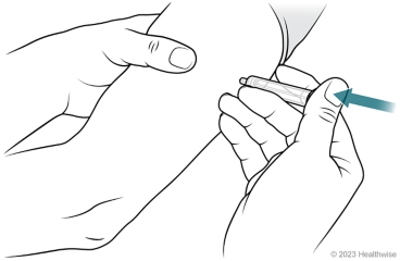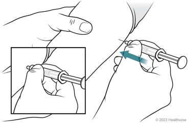 Insert the needle. Keeping your fingers off the plunger, hold the syringe like a pencil close to the site. Then insert the needle.