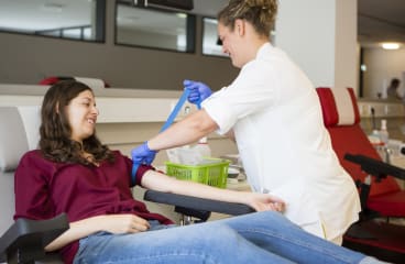 A health professional uses a needle to take a blood sample, usually from the arm.