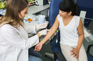 A health professional uses a needle to take a blood sample, usually from the arm.