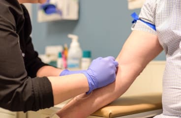 A health professional uses a needle to take a blood sample, usually from the arm.