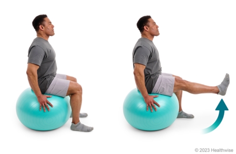 - Slowly straighten one leg at the knee. Slowly lower it back down. Repeat with the other leg.