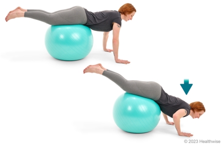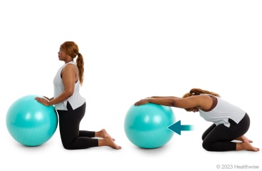 - Press on the ball with your arms and slowly lean forward from your knees. This rolls the ball forward. You will bear most of your weight on your arms. If your back starts to ache, you've gone too far. Pull back a bit.