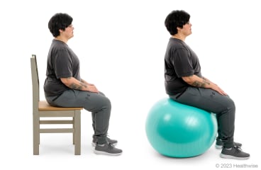 - Rest your hands on the ball near your hip or a steady object next to you. (If you feel very stable on the ball, rest your hands in your lap.)