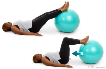 - Lie on your back with your legs up, calves resting on the ball. For more challenge, rest your heels on the ball.