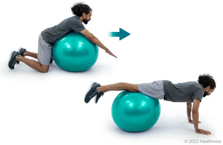 - Holding the plank position, roll as far forward as you can without losing your balance. You may stop with the ball under your thighs, or even under your knees or shins.