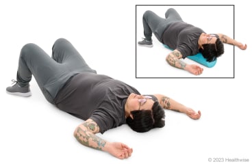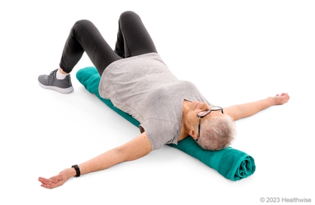 - If you don't feel a mild stretch in your shoulders and across your chest, use a foam roller or tightly rolled towels under your spine, from your tailbone to your head.
