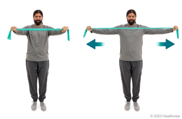 - Slowly pull straight out to the sides, squeezing your shoulder blades together. Keep your arms straight and at chest level. Do not pull your shoulders up toward your ears. Hold for 1 to 2 seconds.