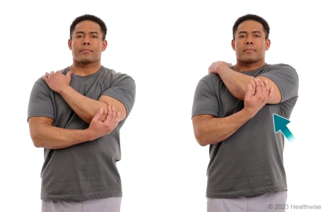 - Use your hand to pull your affected arm gently up and across your body. You will feel a gentle stretch across the back of your affected shoulder.