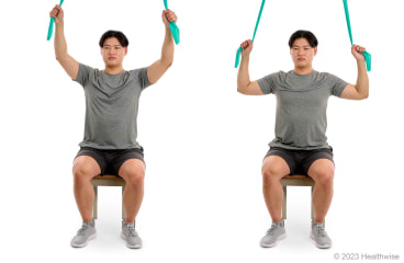 - Start with your arms up and comfortably apart, elbows straight. There should be a slight tension in the band.