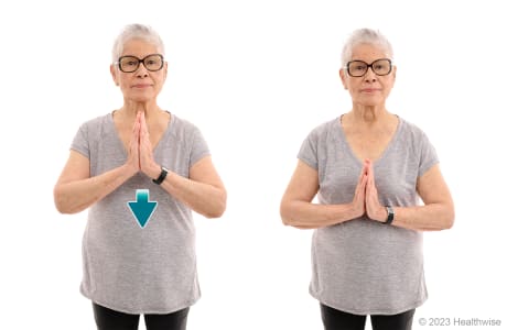 2. Slowly lower your hands toward your waistline, keeping your hands close to your stomach and your palms together. You will feel a mild to medium stretch under your forearms.