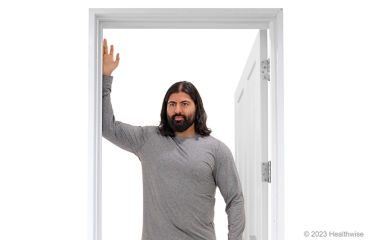 1. Stand in a doorway and place one forearm against the door frame. Your elbow should be bent and a little higher than your shoulder.