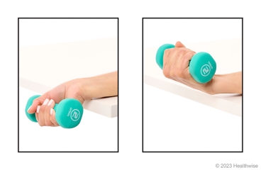 1. Place your affected forearm on a table with your hand hanging over the edge of the table, palm up.