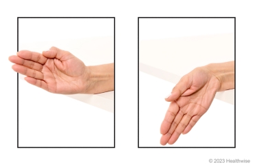 6. Repeat steps 1 through 5. But this time extend your affected arm in front of you with your palm facing up. Then bend back your wrist, pointing your fingers down.