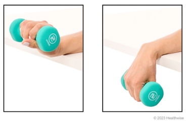 2. Place a 0.5- to 1- kilogram (1- to 2-pound) weight in your hand. This may be a dumbbell, a can of food, or a filled water bottle.