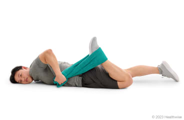 - Lie on your back with your affected leg straight. You can bend your other leg, if that feels more comfortable.