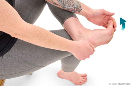 2. Grasp your heel with one hand and then slowly pull your big toe back with your other hand. Pull your toe back toward your ankle until you feel a stretch along the bottom of your foot.