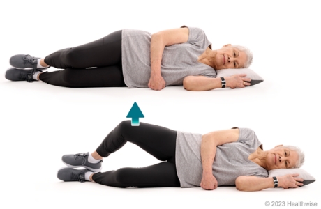 1. Lie on your side, with your affected leg on top and your head propped on a pillow. Keep your feet and knees together and your knees bent.