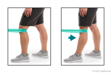 - Loop the other end of the exercise band around the knee of your affected leg. Keep that leg somewhat bent at the knee.