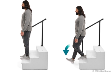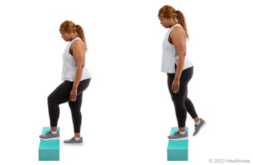 - Stand on a bottom step. Or you can use a thick book or a case of soup cans. If you are not steady on your feet, hold on to a handrail, counter, or wall while you do this exercise.