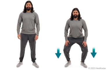 - Slowly bend your knees to lower your body down several centimetres toward the floor. Keep your heels on the floor. Try to keep your back straight at all times, and do not let your pelvis tilt forward or your knees extend beyond the tip of your toes.