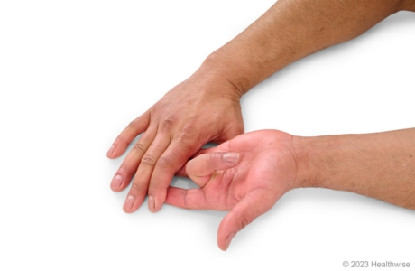 1. Place your good hand on a table, palm up. Put your hand with the affected finger on top of your good hand with your fingers wrapped around the thumb of your good hand like you are making a fist.