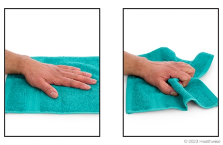 2. Put your hand flat on the towel, palm down. Grab the towel, and scrunch it toward you until your hand is in a fist.