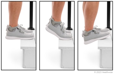 - Keeping both knees straight, slowly lift your heels above the step so that you are standing on your toes. Then slowly lower your heels below the step and toward the floor.