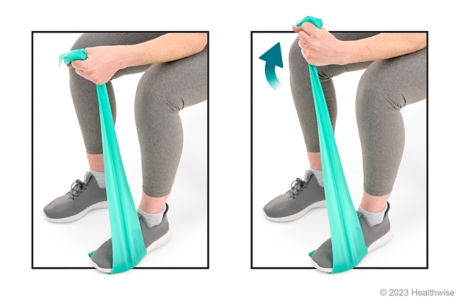 - Grasp one end of an exercise band with your palm down. Step on the other end with the foot opposite the hand holding the band.