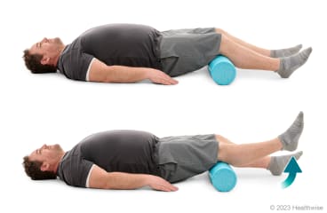 - Lift the lower part of your affected leg and straighten your knee by tightening your thigh muscle. Keep the back of your knee on the foam roll or rolled-up towel.