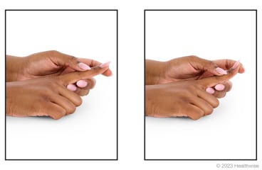 1. Grasp your affected finger with your other hand. Your thumb will be on the top side of this finger. Place your thumb just below the joint that is closest to your fingernail. The index (pointing) finger of your other hand should be underneath the tip of the affected finger.