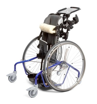 Like the prone standing frame, this style of standing frame supports your child from the front. The main difference is that there are 2 large wheels on either side. This allows your child to push themselves around while in a standing position. Your child will need to be able to help you get them into this standing frame using a supported standing transfer.