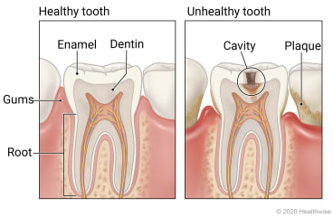 Any part of your child's tooth can decay, from the roots below the gum line to the chewing surface. Decay can affect the outer layer (enamel) and inner layer (dentin) of your child's teeth. The deeper the decay, the worse the damage.
