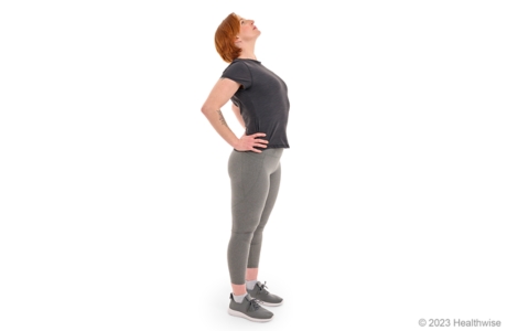 - Bend backward as far as you can, keeping your knees straight. Hold this position for a few seconds. Then return to your starting position.