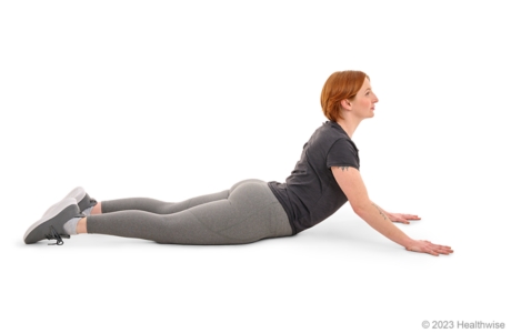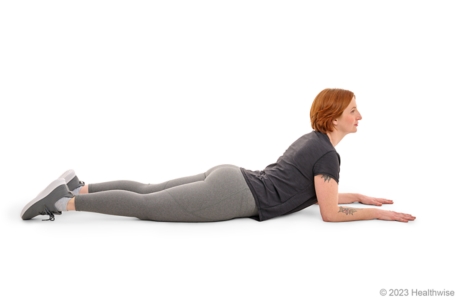 - Lie on your stomach, face down. Keep your elbows tucked into your sides and under your shoulders.