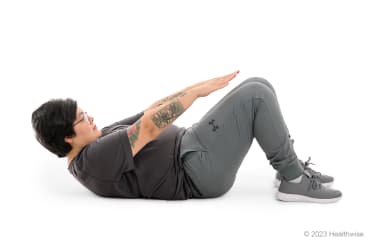 - Slowly tighten your belly muscles and raise your head and shoulder blades off the floor. At the same time, reach to one side with both arms. Keep breathing normally and don't hold your breath.