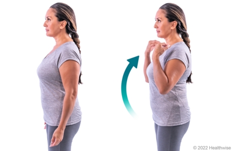 - Stand or sit up straight. If you're standing, keep your feet about hip-width apart. Reach your affected arm straight up.