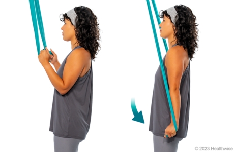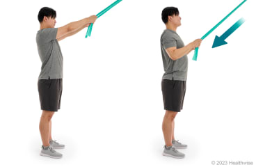 - Stand so that you face the place where you secured the band. Hold one end of the band in each hand, with your hands at shoulder level.