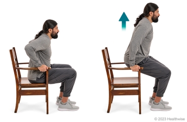 - Place your hands on the armrests and use your arms to push yourself up from the chair.