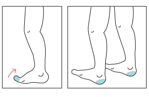 Stand on a flat surface. Stretch your toes upward. For balance, hold on to the wall or something stable. If it feels okay, take small steps walking on your heels.