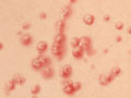 In babies and small children, itching and skin irritation may also occur on the scalp, neck, and face and on the palms of the hands and soles of the feet.